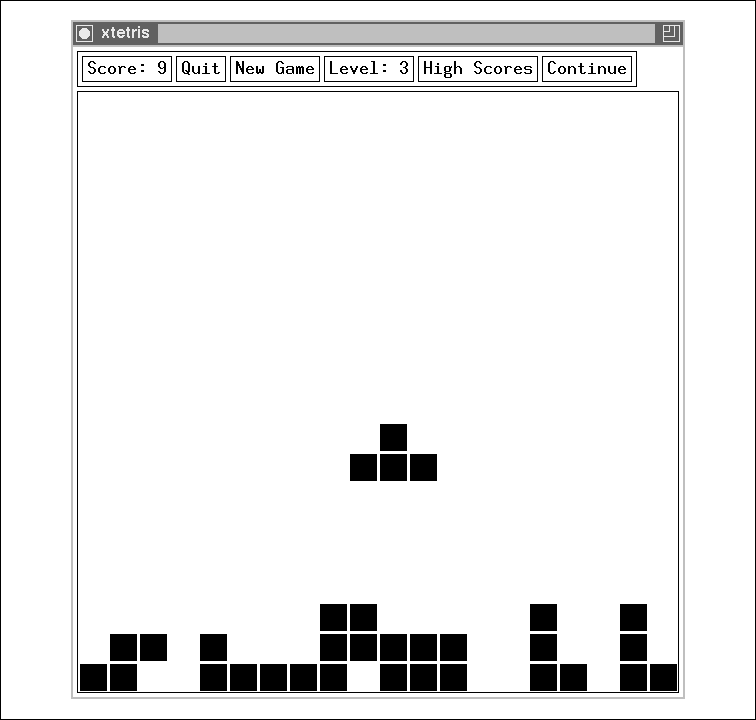 Notice also that a timeout function is called with only one argument, client_data. Inside a widget, this argument is commonly used to pass in the widget instance pointer. Also notice that every time a block hits the bottom, the instance variable delay is decremented by 5, which reduces the number of milliseconds of delay used when XtAppAddTimeOut() is next called. In other words, the blocks fall progressively faster.