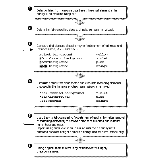 [64] The actual algorithm used by Xt differs slightly from that described here, because there are shortcuts that the resource manager takes that are hard to follow even if you have the source code. However, the algorithm described here gives the same result, with more clarity.