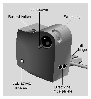 The O2Cam color digital video camera captures images and video recordings. It has a built-in microphone that points in the same direction as the lens. When you record audio, speak toward the front of the camera, not toward the microphone on the side.
