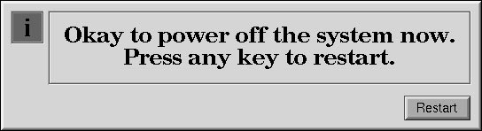A message telling you it is okay to power off. When you see this notifier, you can press and release the power button on the front of the workstation. Or, to shut down and restart the system without powering off, click Restart.
