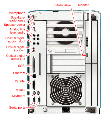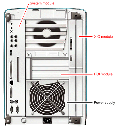 Use these illustrations to familiarize yourself with the ports and modules on the OCTANE workstation. Click on the red port name to bring up the port pinout. Click on the red module name to bring up a view of the interior of the module.